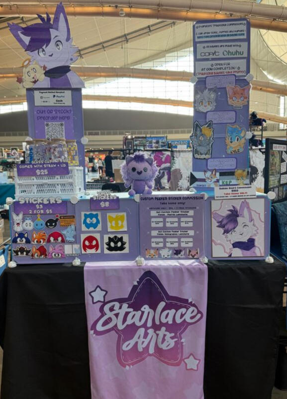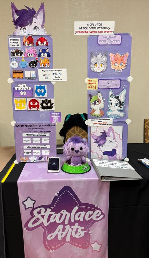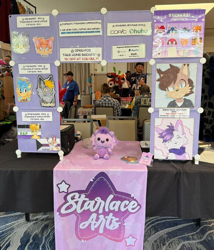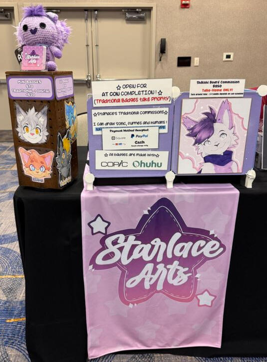 Below are a few badge commissions I've done plus some examples of my merch ! I also have examples of what my booth may look like at some conventions!